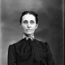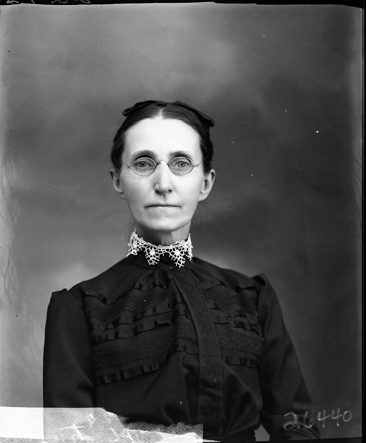 Portrait photograph of an unidentified woman with her hair pulled back and wearing glasses.