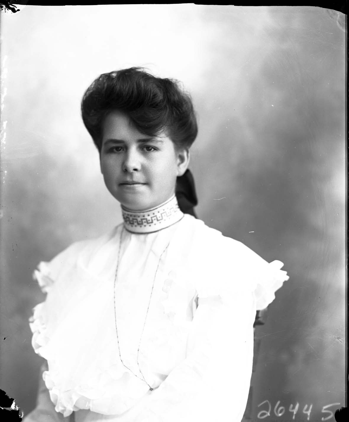Portrait photograph of an unidentified young woman with her hair styled back and wearing an embroidered collar on her dress.