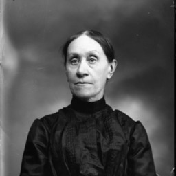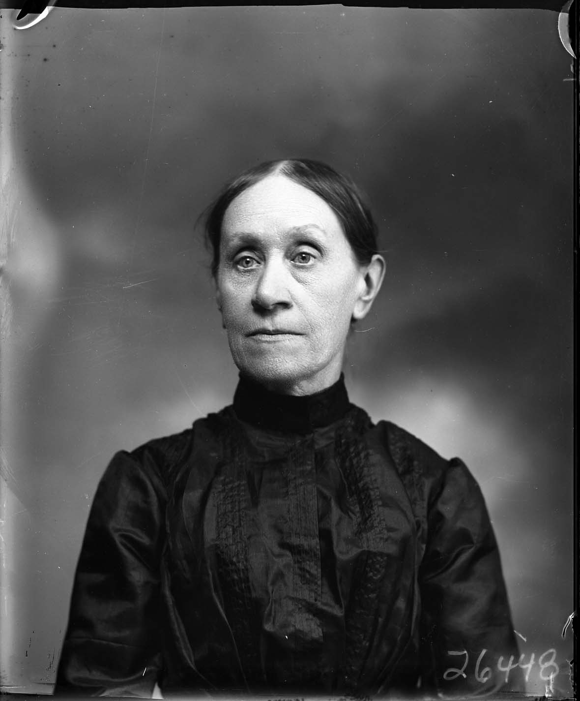 Portrait photograph of an unidentified woman with her hair pulled back and wearing a dark-colored dress.