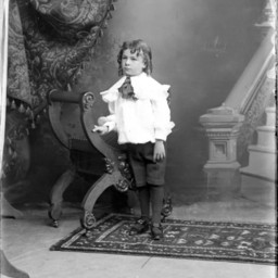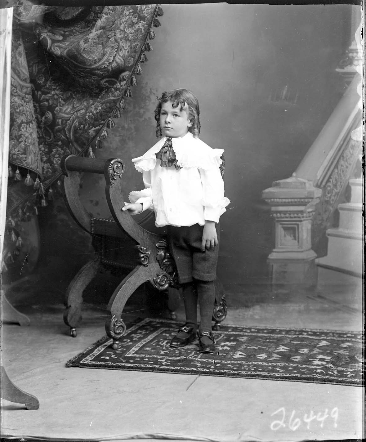 Unidentified boy with curled hair is wearing a wide collar with a bow and short pants. He is standing by a chair.