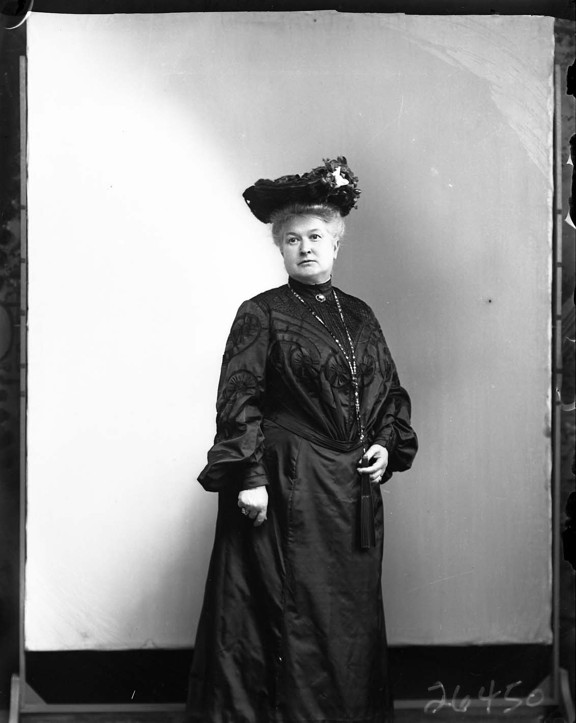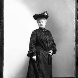 Unidentified older woman wearing a hat and dark-colored dress is posed standing in the studio.