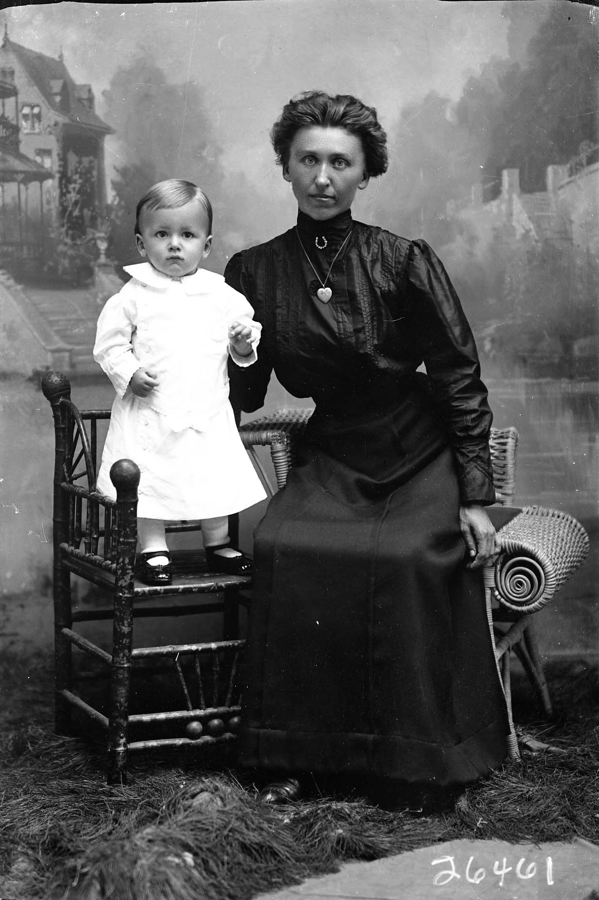 Unidentified woman wearing a heart necklace and a long skirt is seated beside an unidentified young child who is standing on a chair.