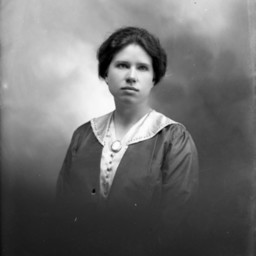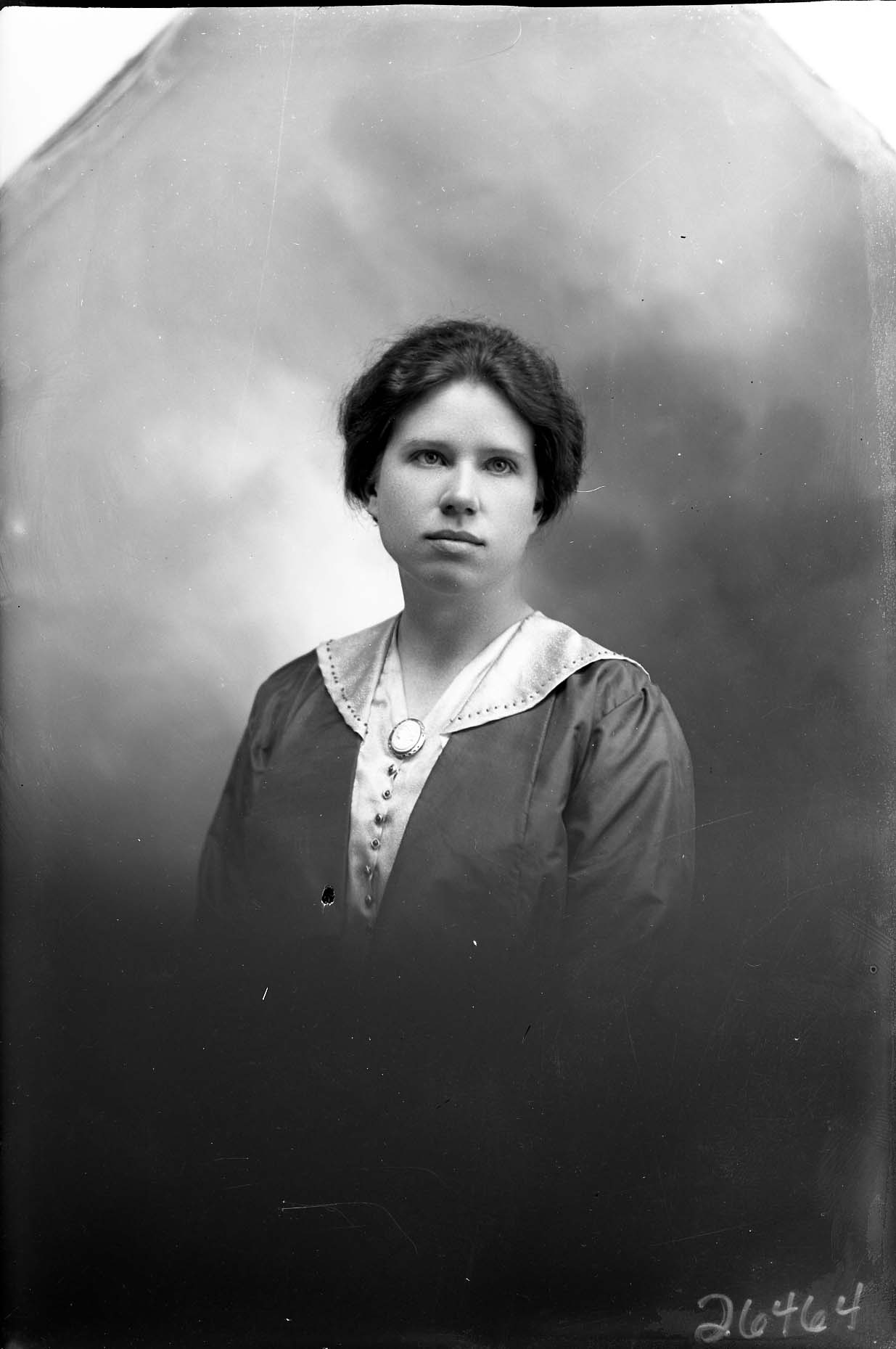 Portrait photograph of an unidentified woman with her hair pulled back and wearing a cameo pin on her dress.