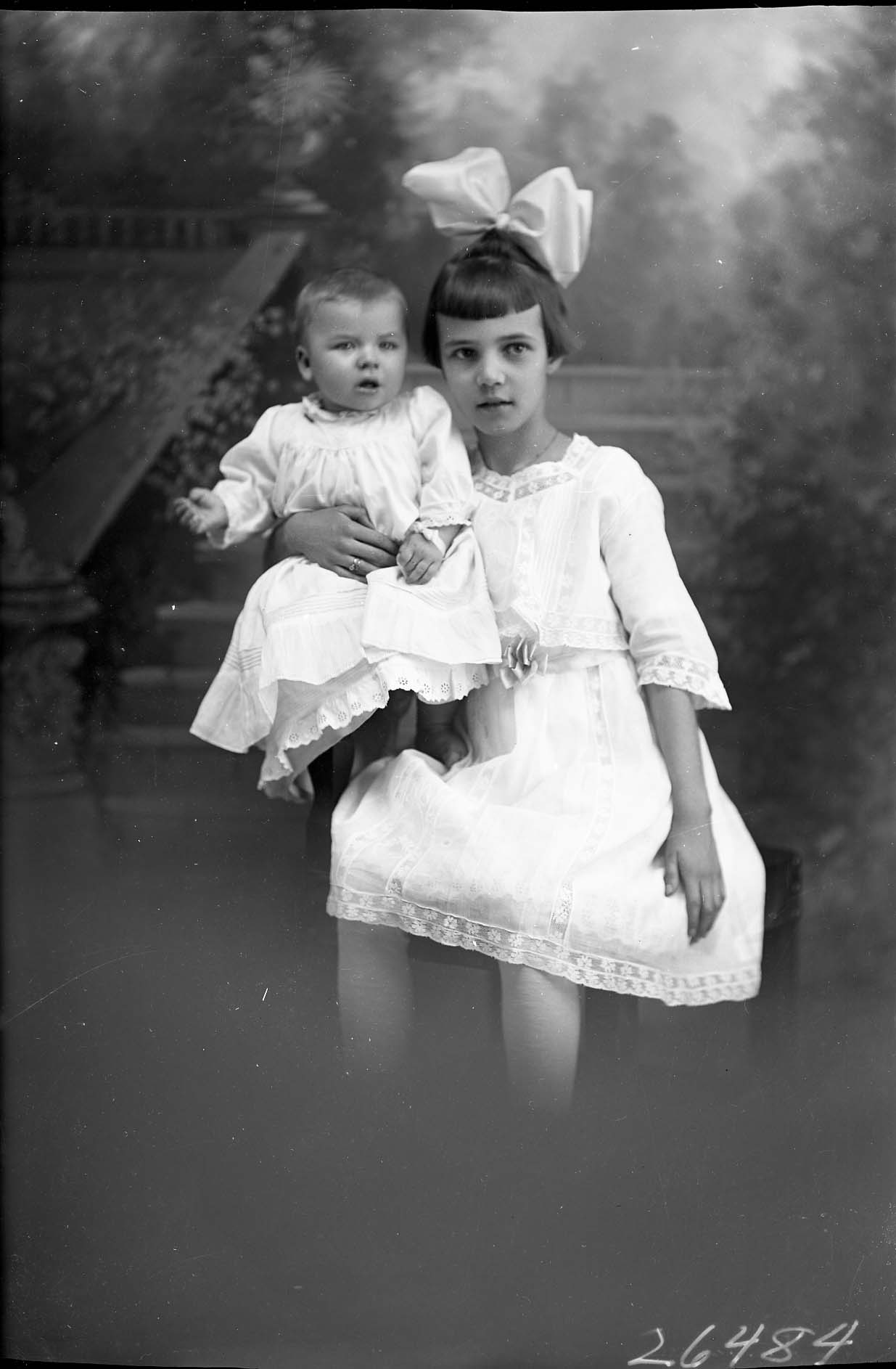 Two unidentified children, a barefoot toddler and an older girl with a bow in her hair, are posed together.