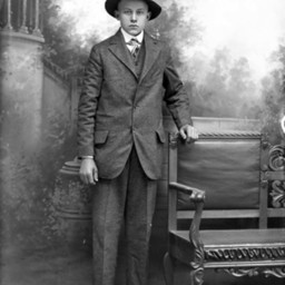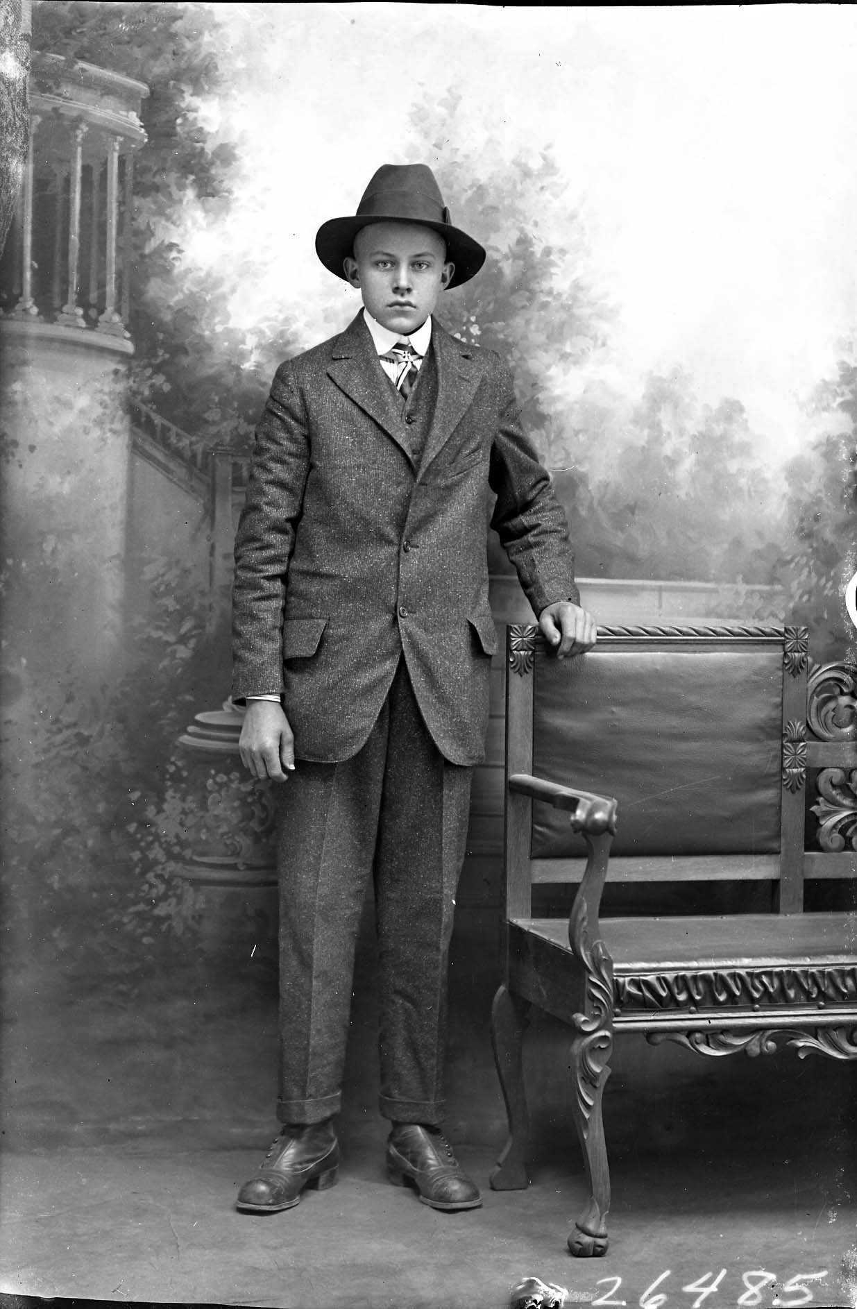 Unidentified boy, probably teen-aged, is wearing a hat, suit, and tie. He is standing by a bench.