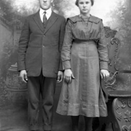Unidentified young man in a suit and tie with a starched collar is standing beside an unidentified young oman in a long-sleeved dress.