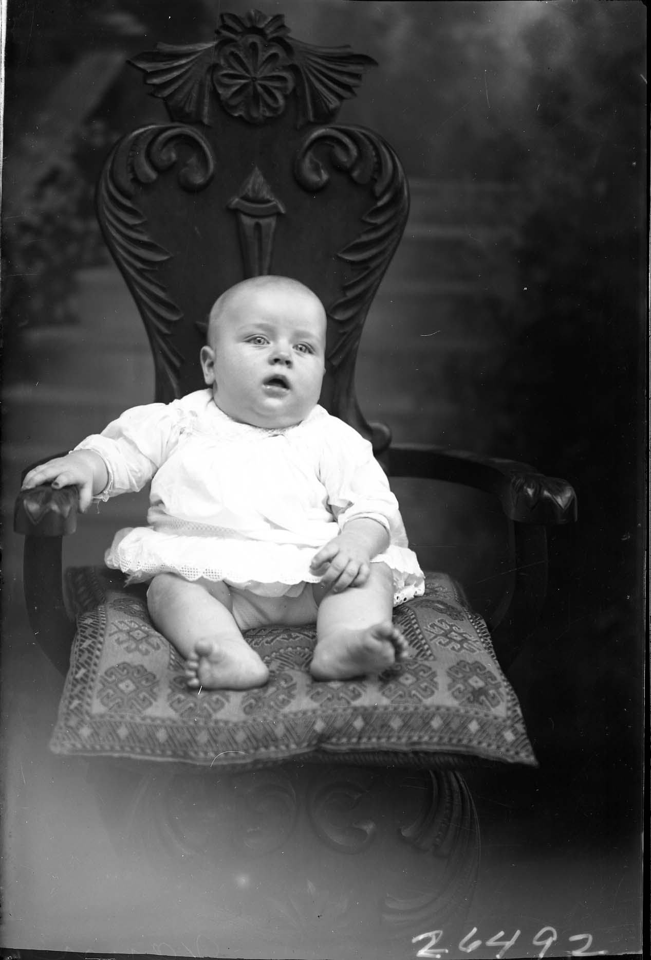 Unidentified barefoot baby is posed on a pillow on a chair.