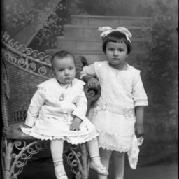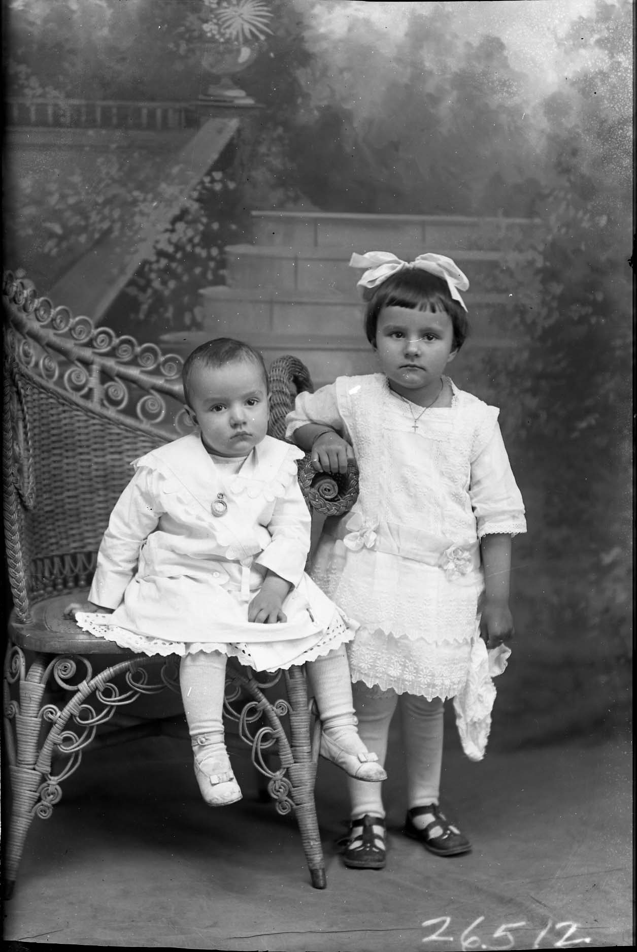 Two unidentified young children, a toddler on a wicker chair and an older girl with a bow in her hair, are posed together.