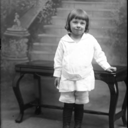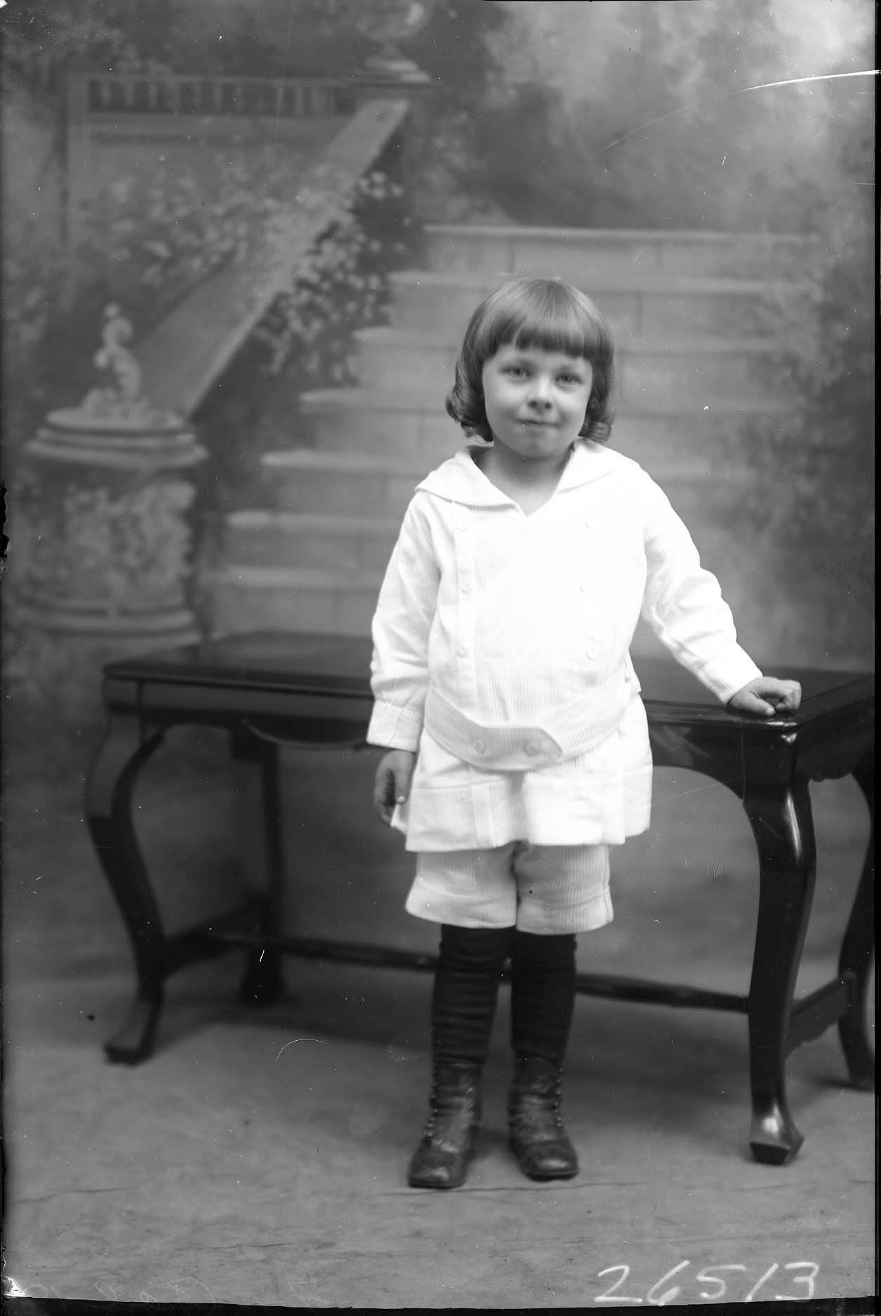 Unidentified young boy in short pants and bangs is standing in front of a bench.