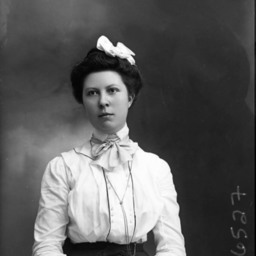 Portrait photograph of an unidentified woman with a bow in her hair and wearing a blouse with a tied bow around her neck and a watch chain extending down the front of it.