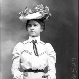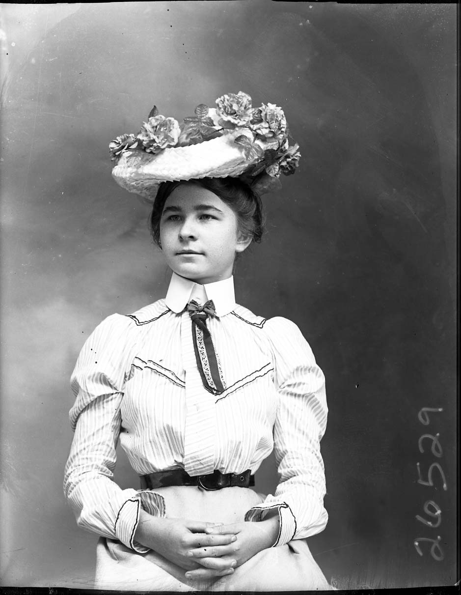 Unidentified woman is wearing a hat decorated with flowers and a high, starched collar on her blouse. Her hands are clasped in her lap.