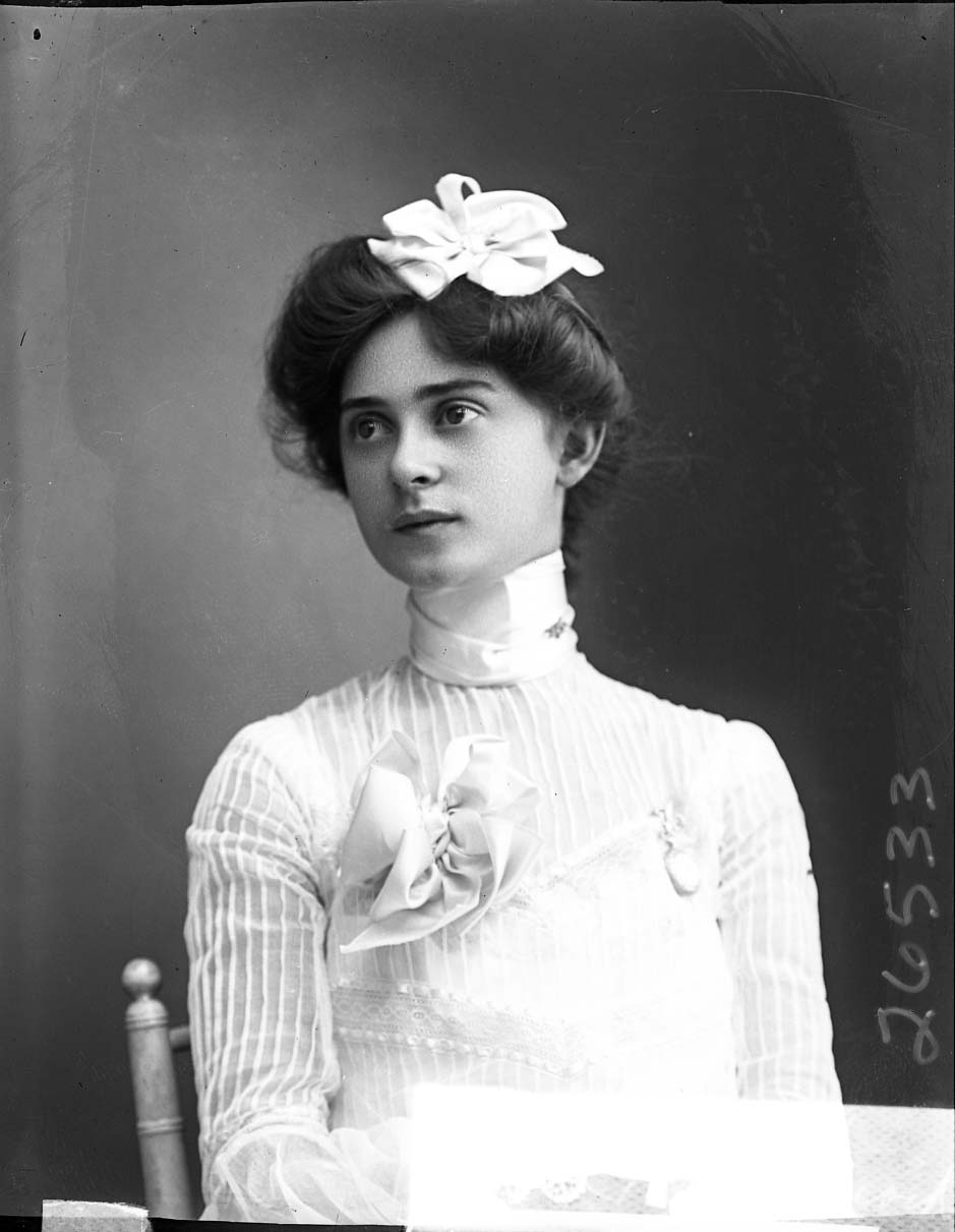 Portrait photograph of an unidentified woman with a bow in her hair and wearing a dress with a corsage and pocket watch pinned to it.