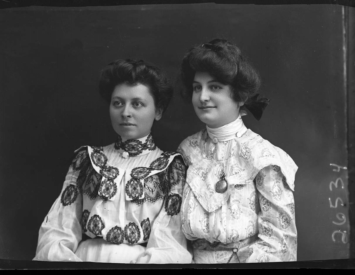 Portrait photograph of two unidentified women posed together. Both have their hair styled up. The woman on the right has a pocket watch pinned to her blouse.