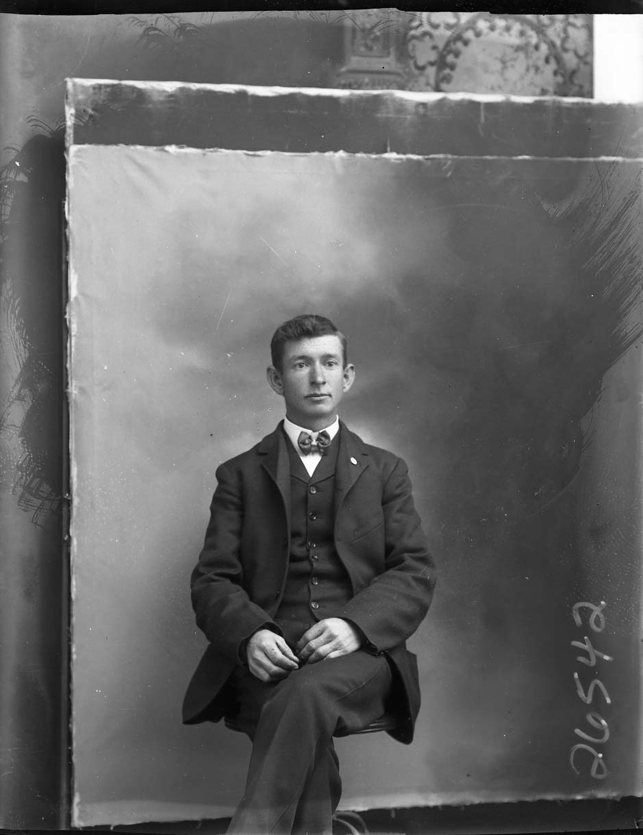 Unidentified young man is seated on a stool with his legs crossed and wearing a suit and bow tie.
