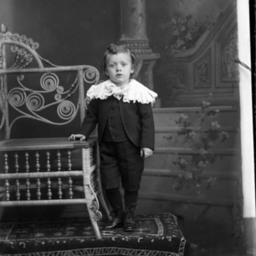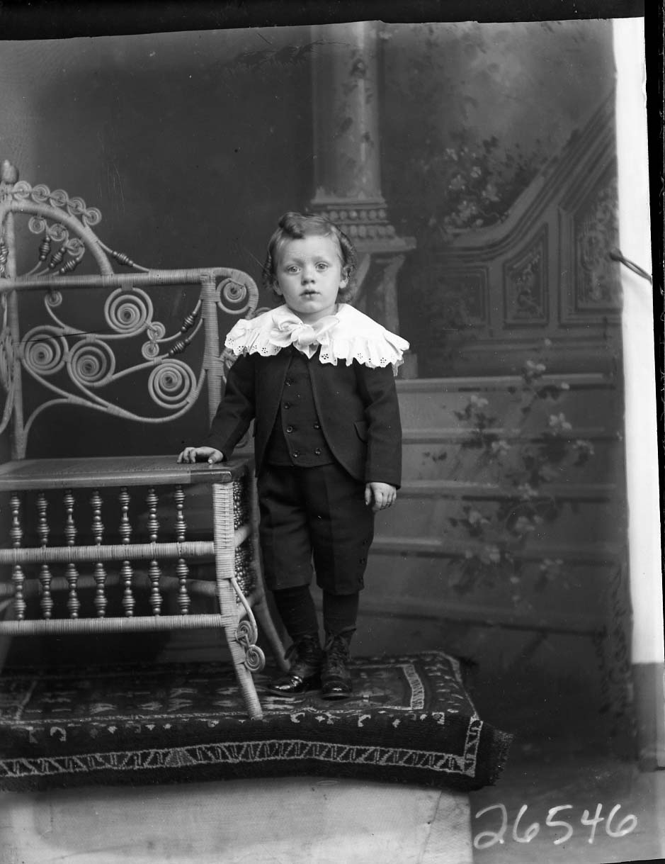 Unidentified young child with curled hair is wearing a suit with short pants and a tied collar or shawl around his shoulders. He is standing by a wicker chair.