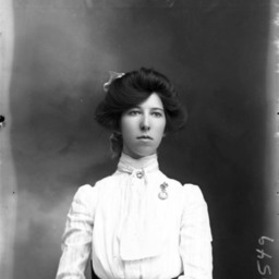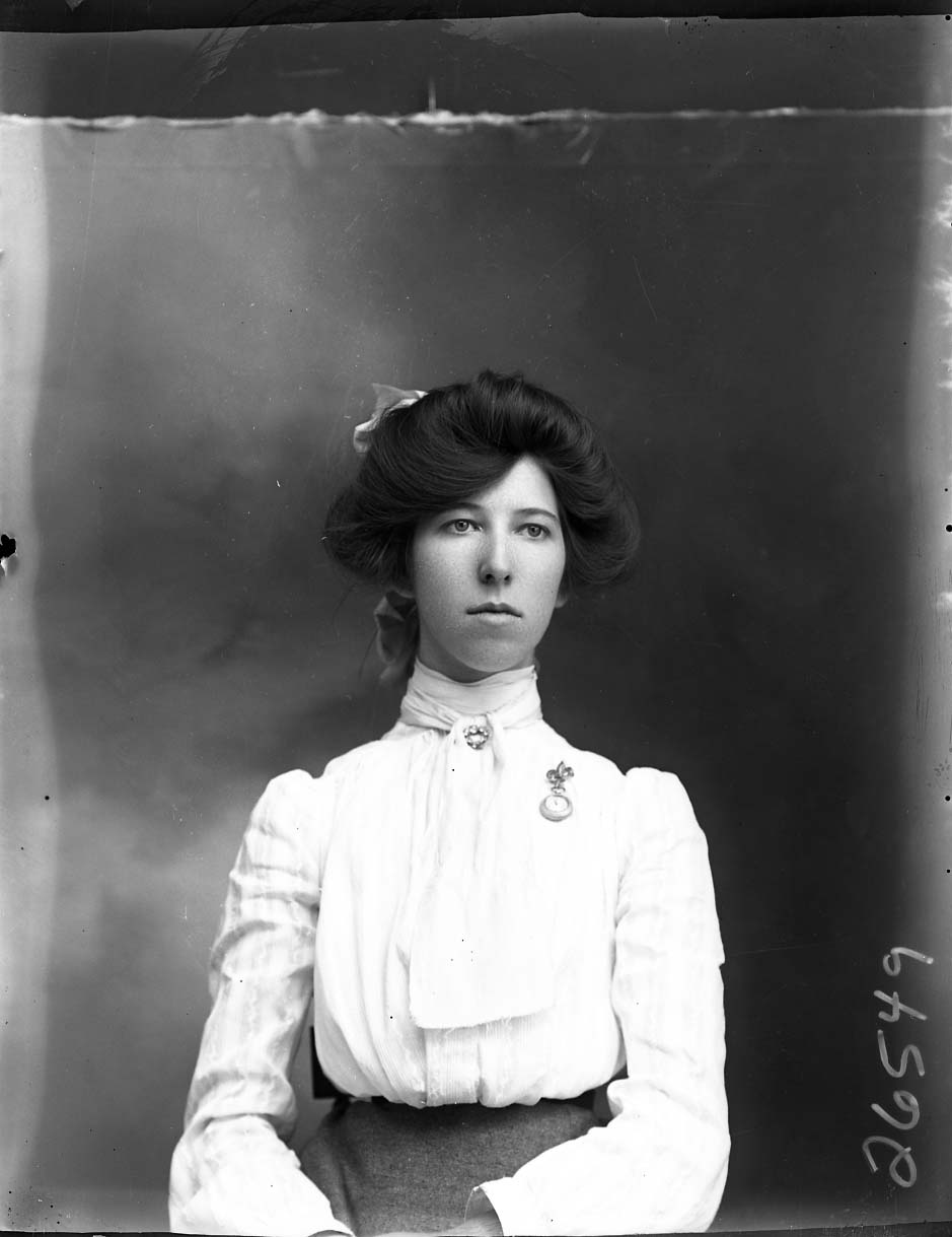 Portrait photograph of an unidentified woman with her hair styled up and wearing a pocket watch pinned to her blouse.