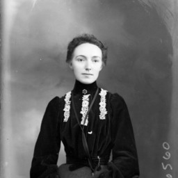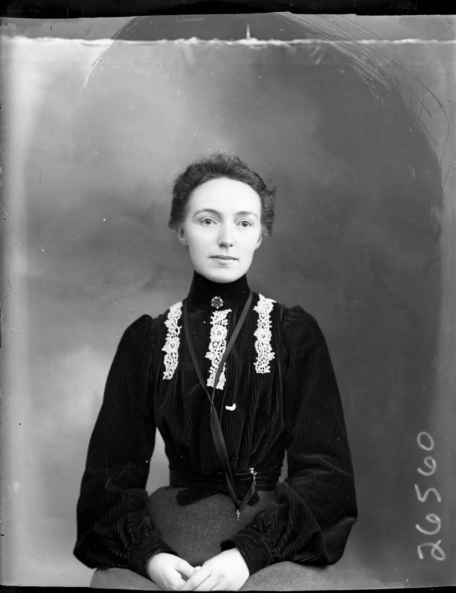 Portrait photograph of an unidentified woman with her hair pulled back and wearing a dark-colored dress with rows of vertical white lace down the front.