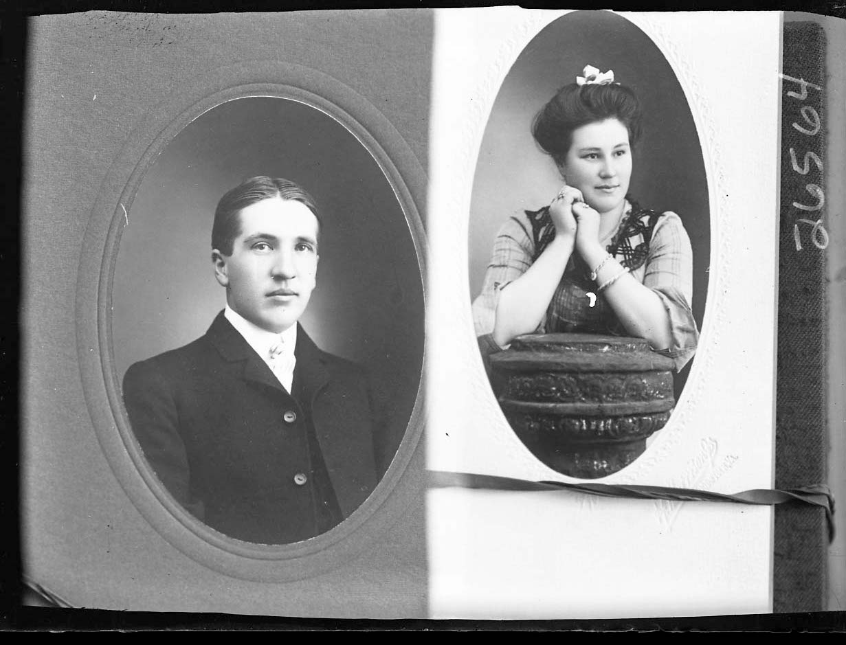 Photo of two separate framed portrait photographs, one of an unidentified young man and the other of an unidentified young woman.
