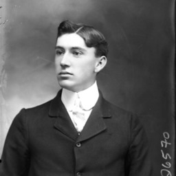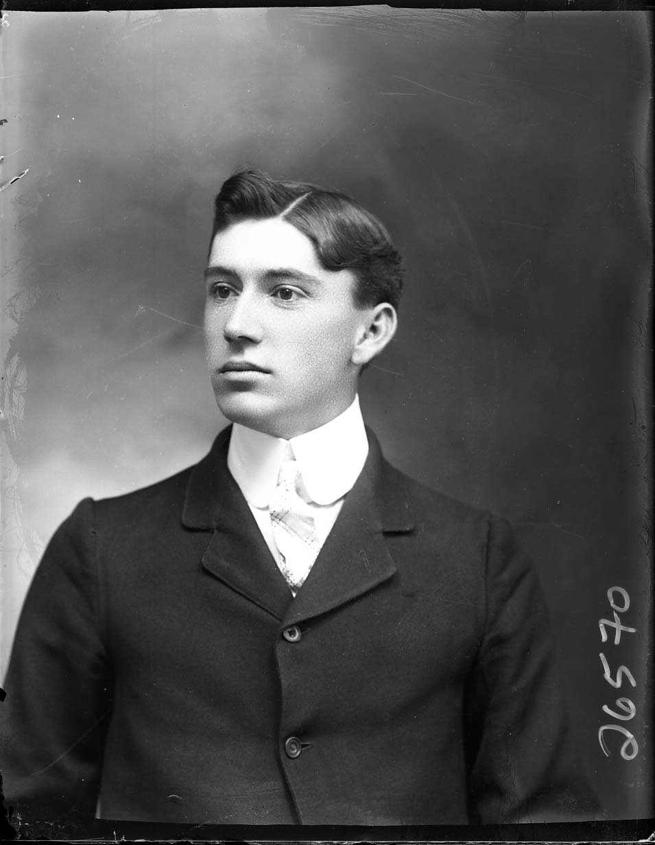 Portrait photograph of an unidentified young man wearing a suit and tie with a starched collar.