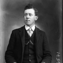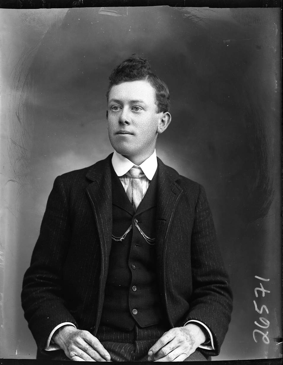 Portrait photograph of an unidentified young man wearing a suit and tie. A chain is visible attached to his vest.
