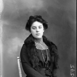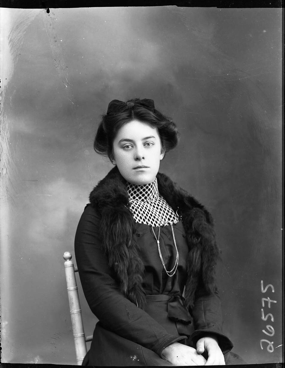Portrait. photograph of an unidentified woman with her hair pulled up and wearing a fur stole around her neck.