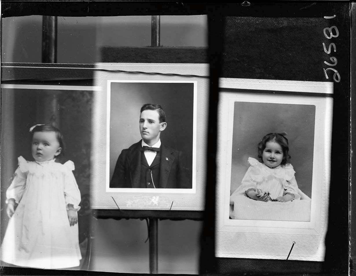 Photo of three separate photographs of different unidentified people, a young man wearing a bow tie in the middle and two unidentified children on either side.