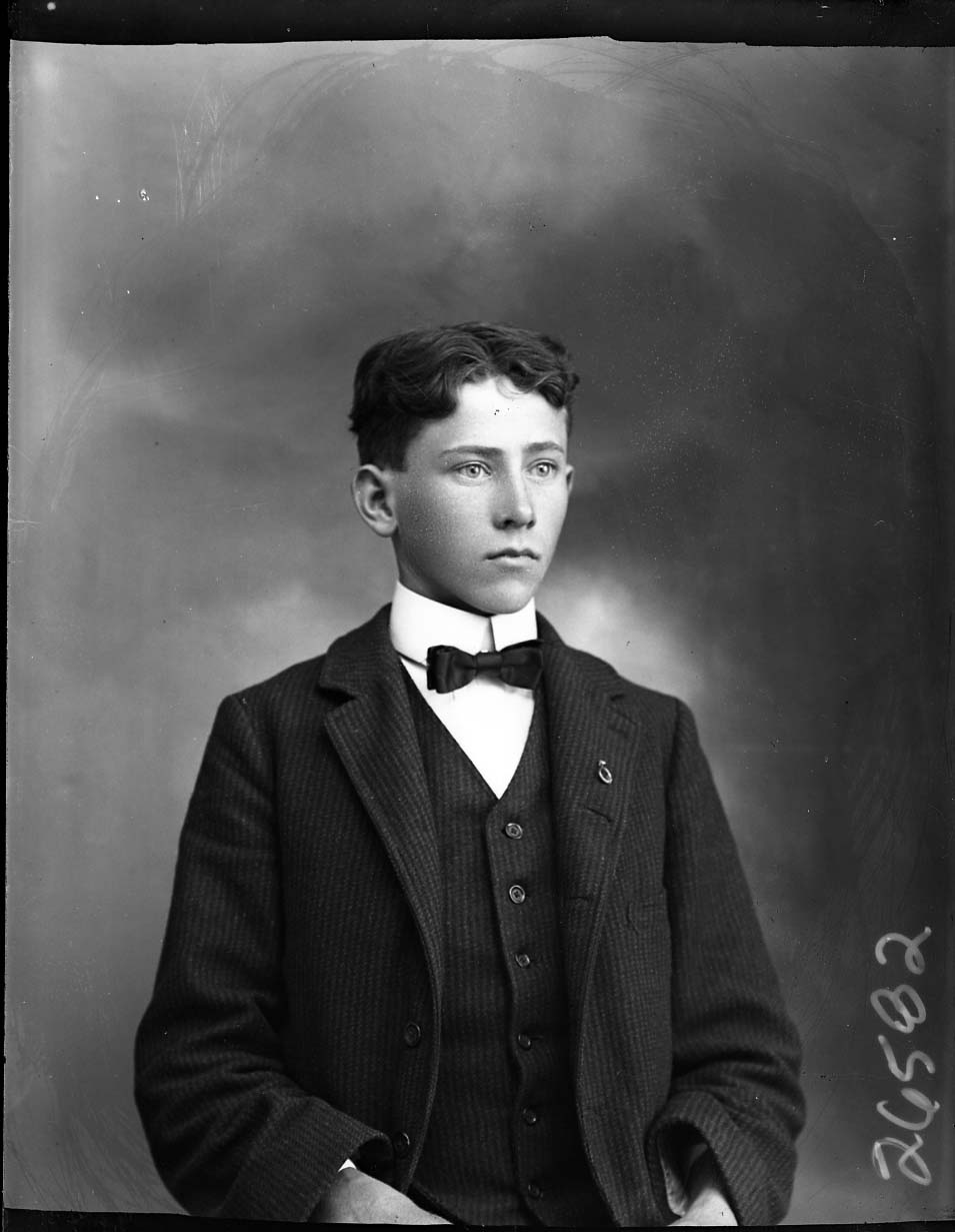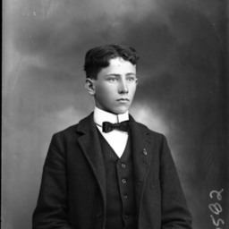 Portrait photograph of an unidentified young man wearing a suit and bow tie with a starched collar.