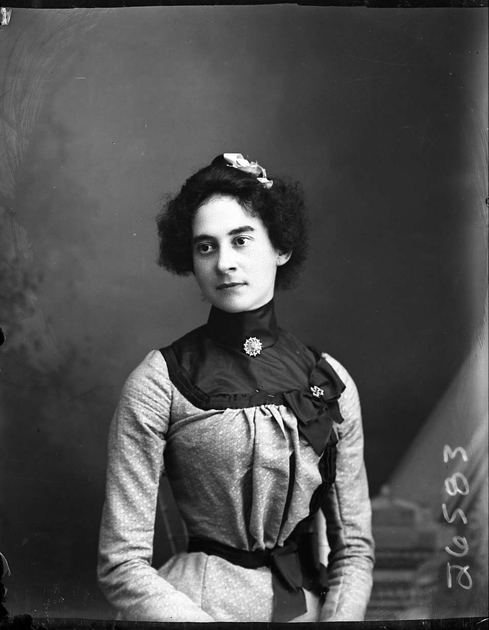 Unidentified young woman with her curly hair held with a barrette is wearing a long-sleeved dress with a brooch on the front.