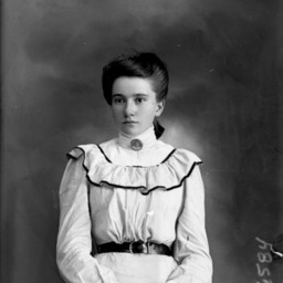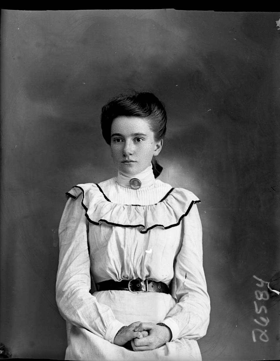 Portrait photograph of an unidentified young woman with her hands in her lap.