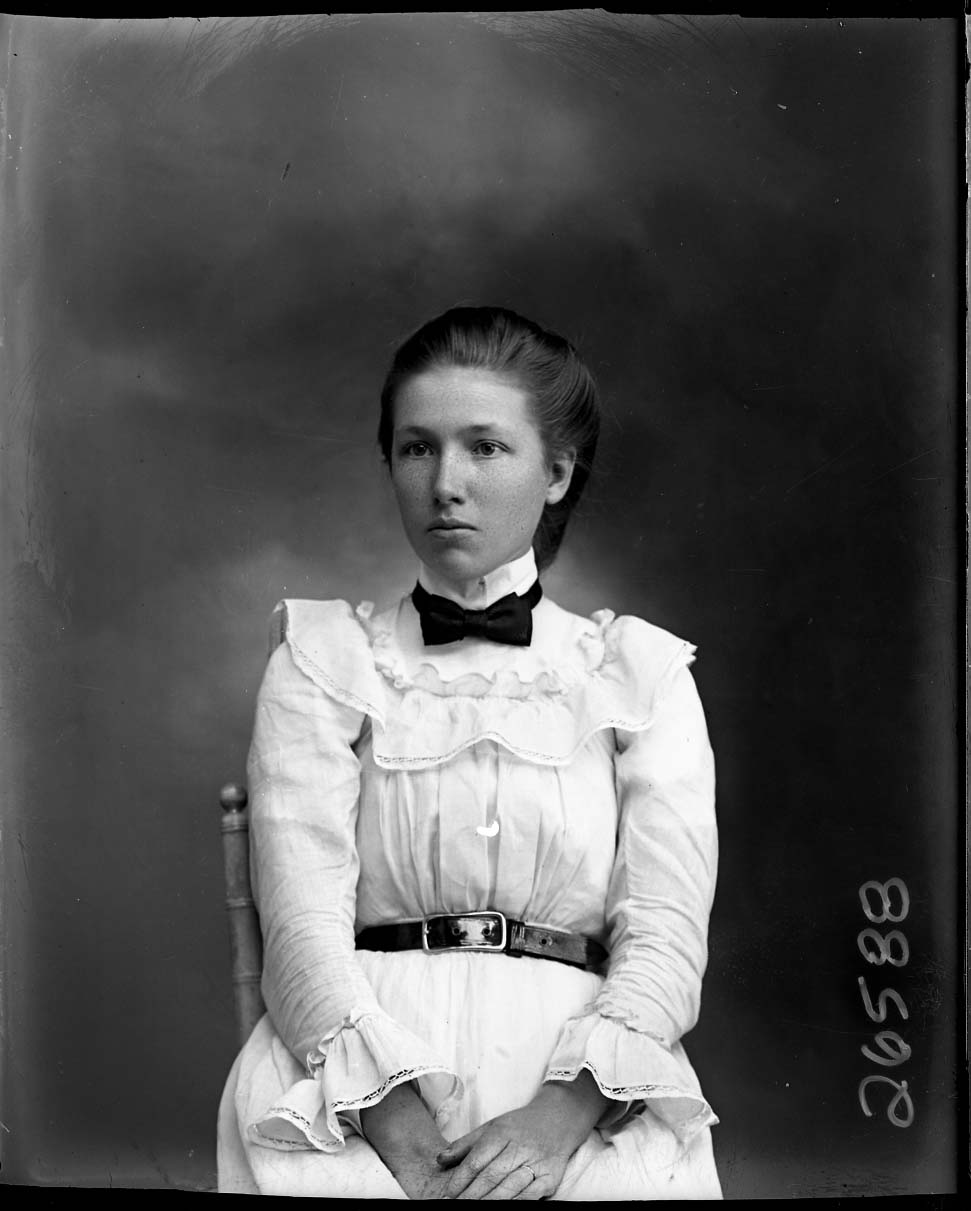 Unidentified young woman with her hair combed back and wearing a bow tie around the collar of her dress.