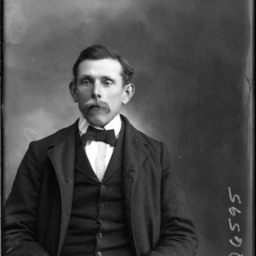 Portrait photograph of an unidentified man with a mustached and wearing a suit and bow tie with a starched collar.