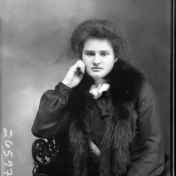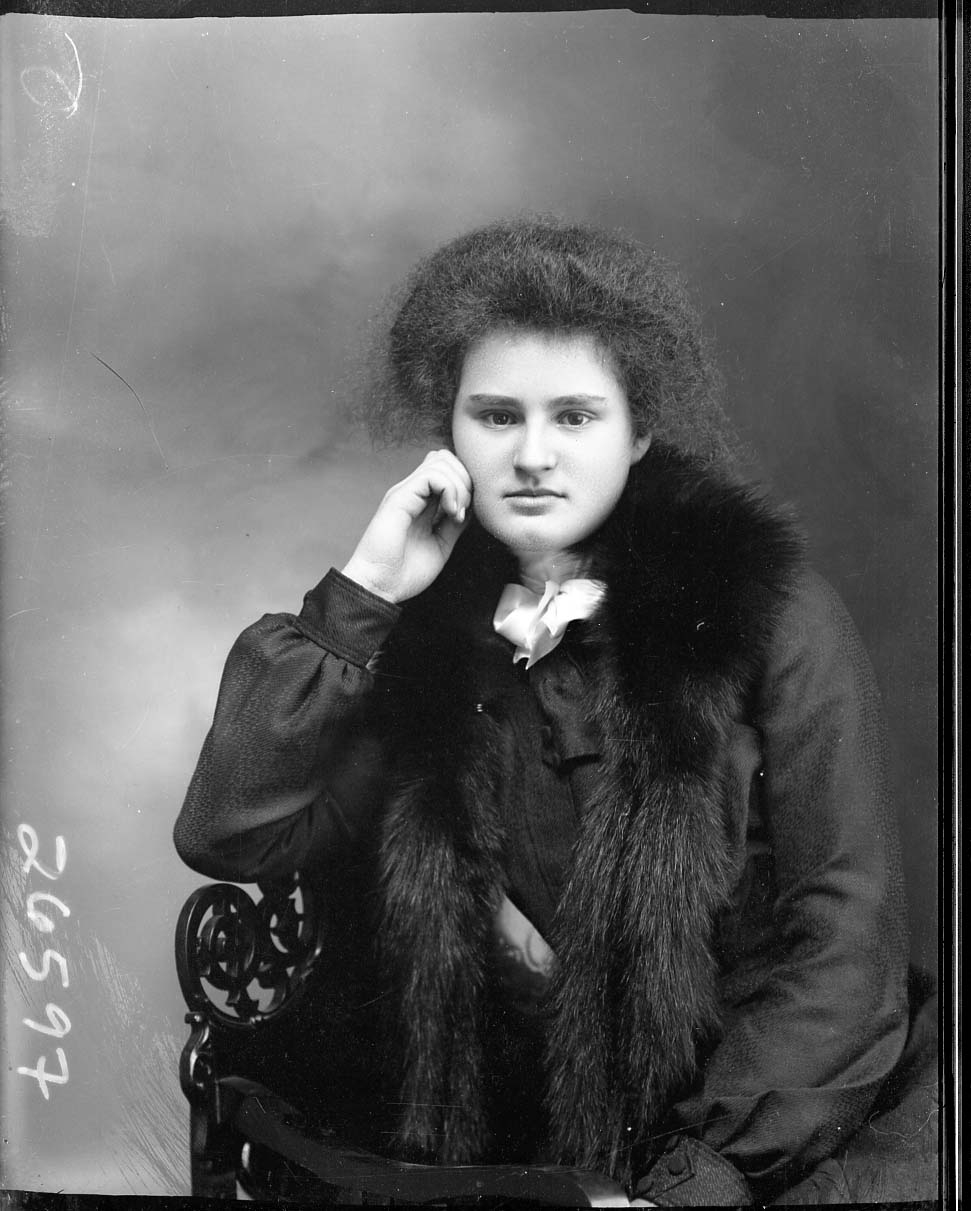 Portrait photograph of an unidentified woman with her frizzy hair pulled back and wearing a fur stole.
