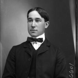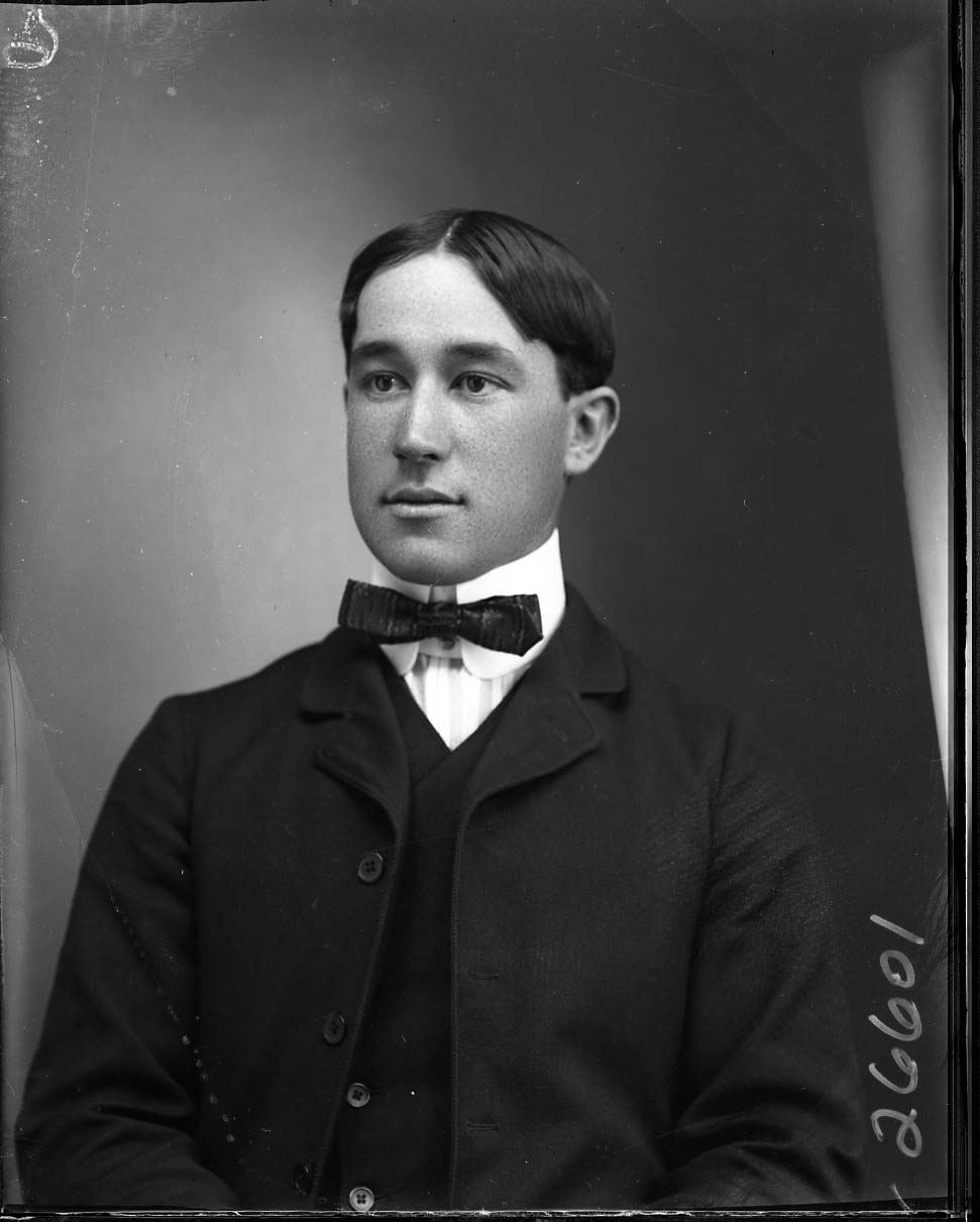 Portrait photograph of an unidentified young man wearing a suit and bow tie with a starched collar.