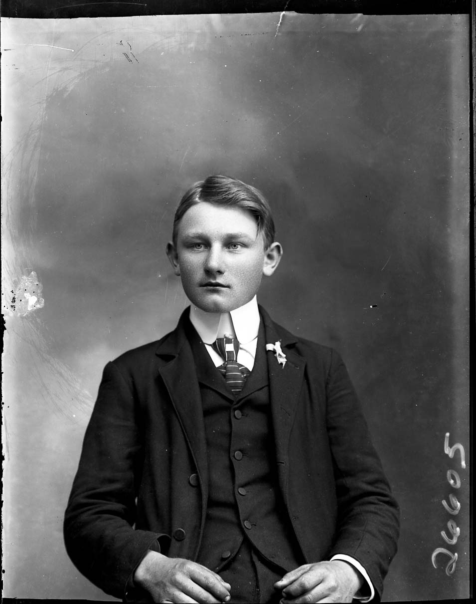 Portrait photograph of an unidentified young man wearing a suit and horizontally-striped tie with a starched collar. He also has a ribbon on his lapel.