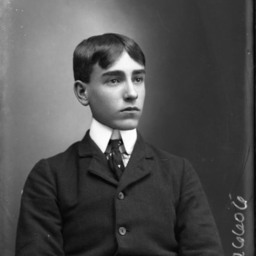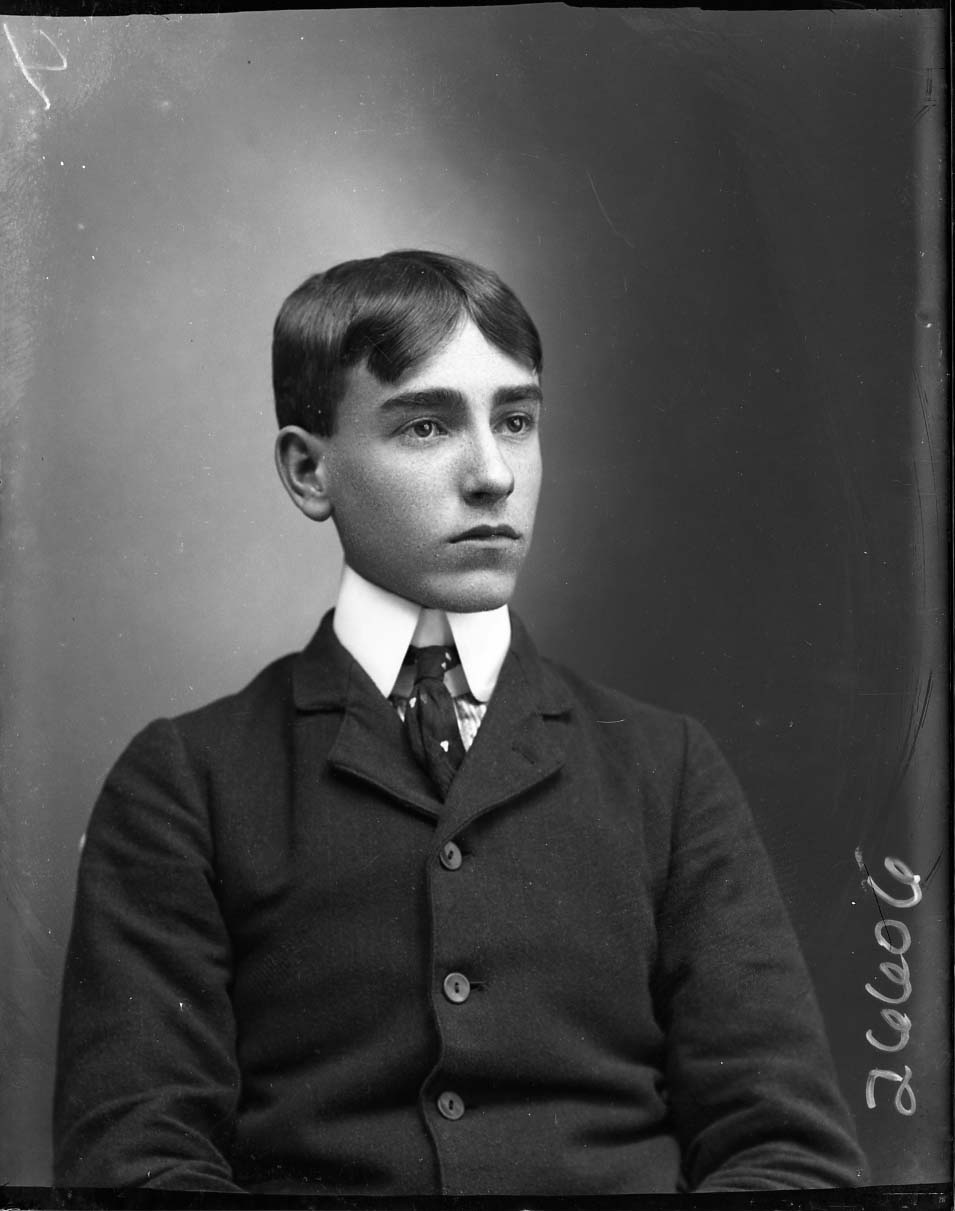 Portrait photograph of an unidentified young man wearing a suit and tie with a starched collar.