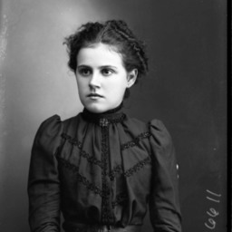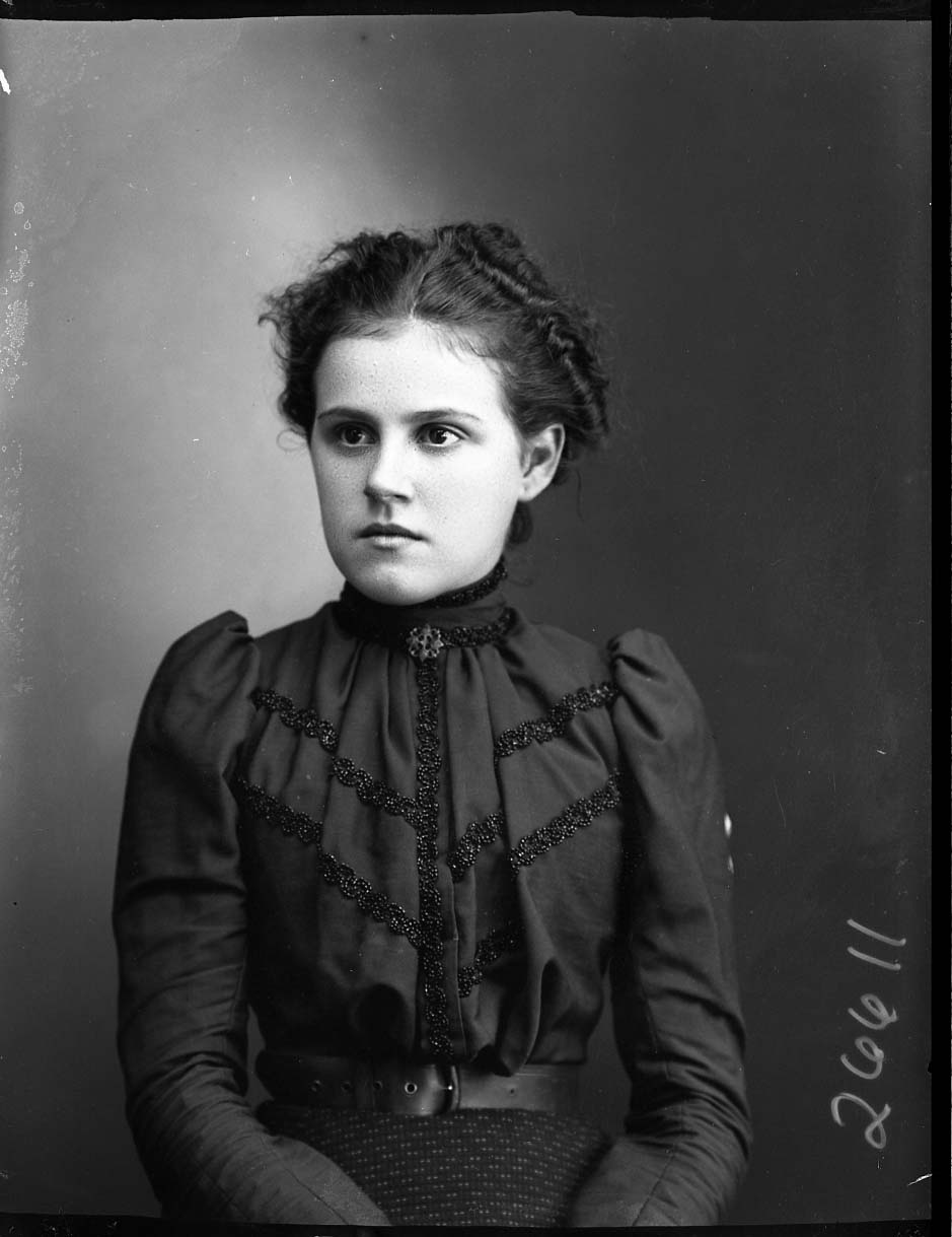 Portrait photograph of an unidentified young woman with her hair styled back and wearing a long-sleeved, dark dress.