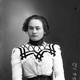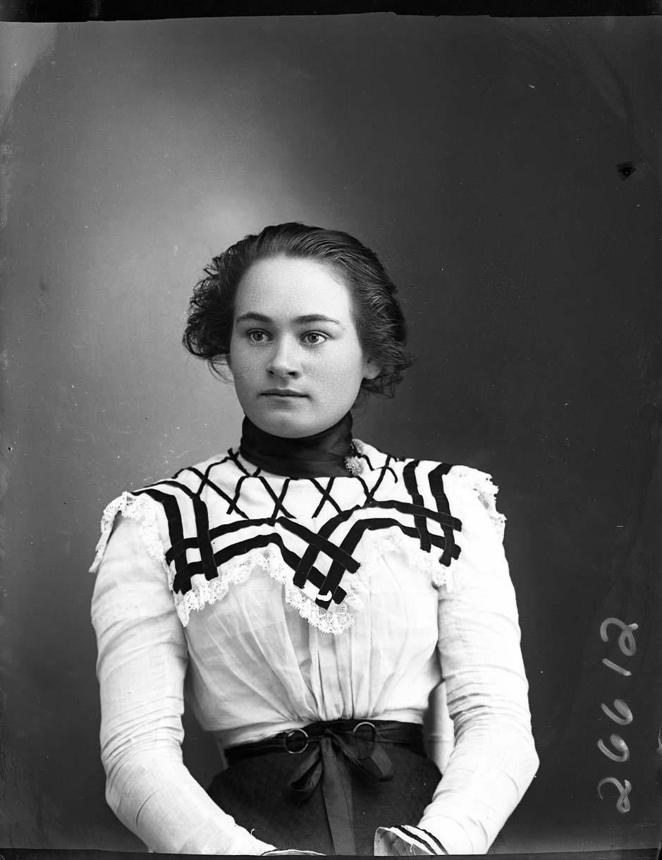 Portrait photograph of an unidentified young woman with her hair pulled back and wearing a fashionable blouse and skirt.