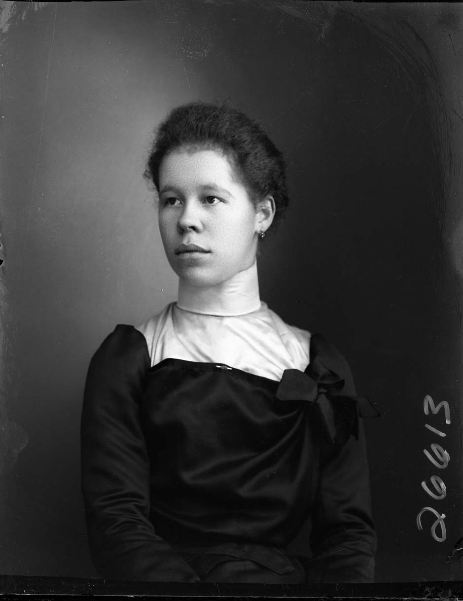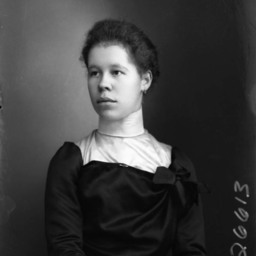 Portrait photograph of an unidentified young woman with her hair pulled back and wearing a dress with a high collar,