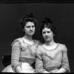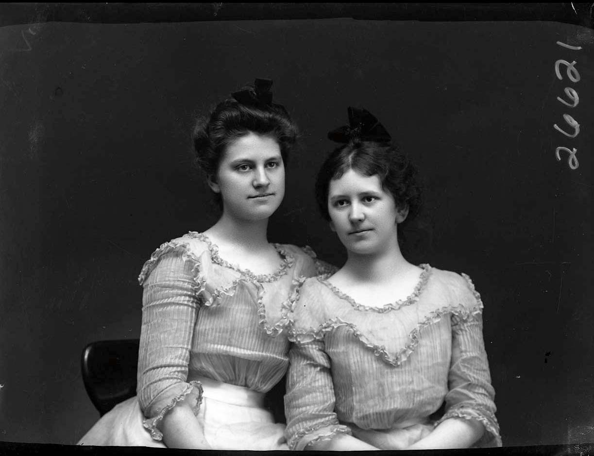 Two unidentified young women posed together and wearing matching outfits and bows in their hair.
