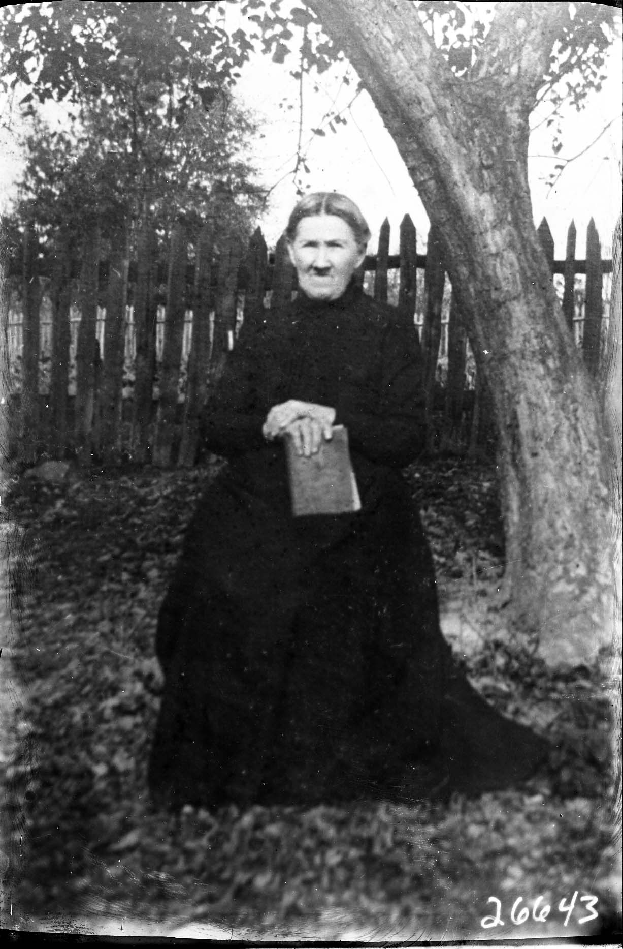 Photo of a photograph of an unidentified older woman seated outdoors and holding a book.