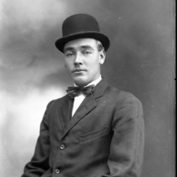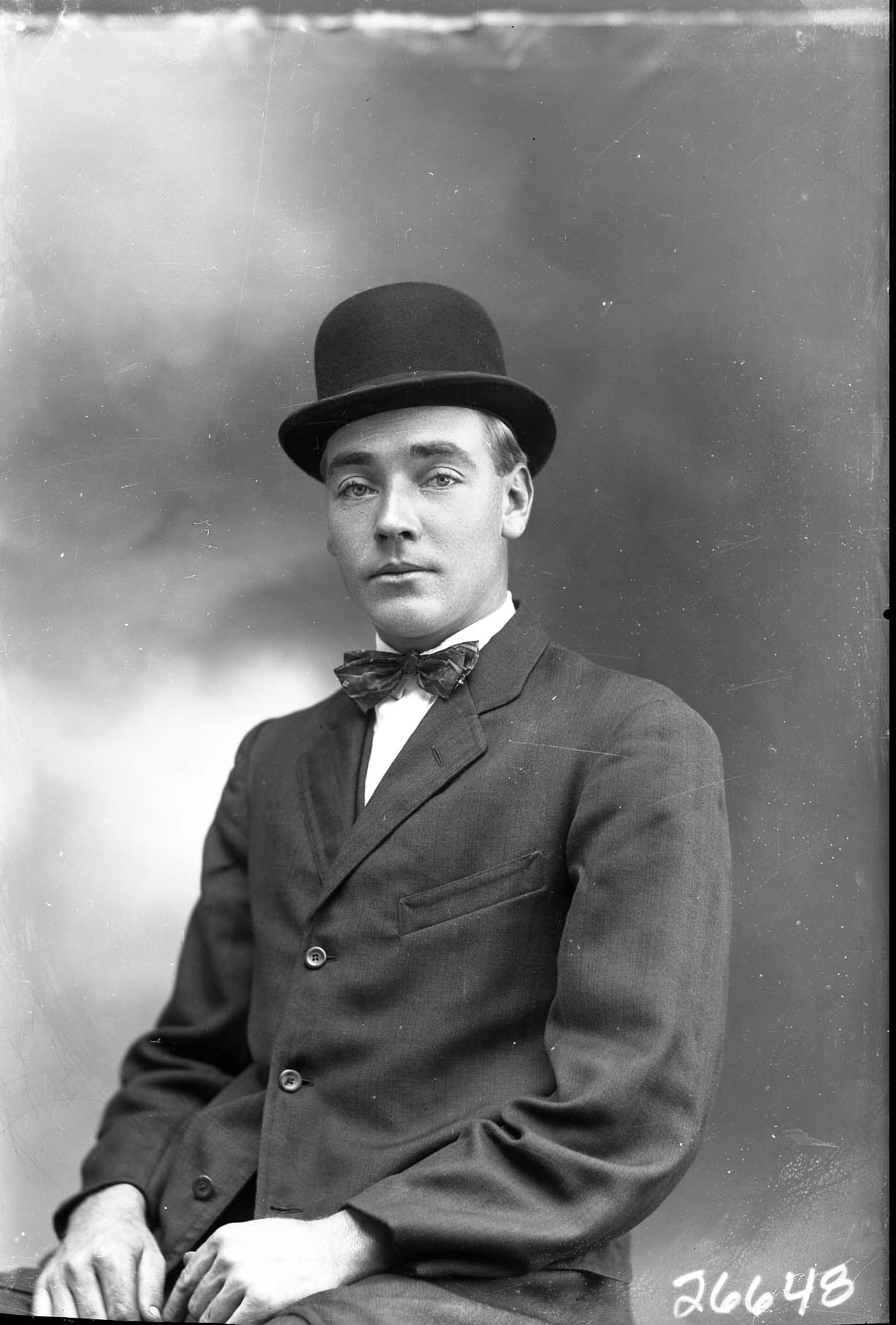 Portrait photograph of an unidentified young man wearing a hat and bow tie.