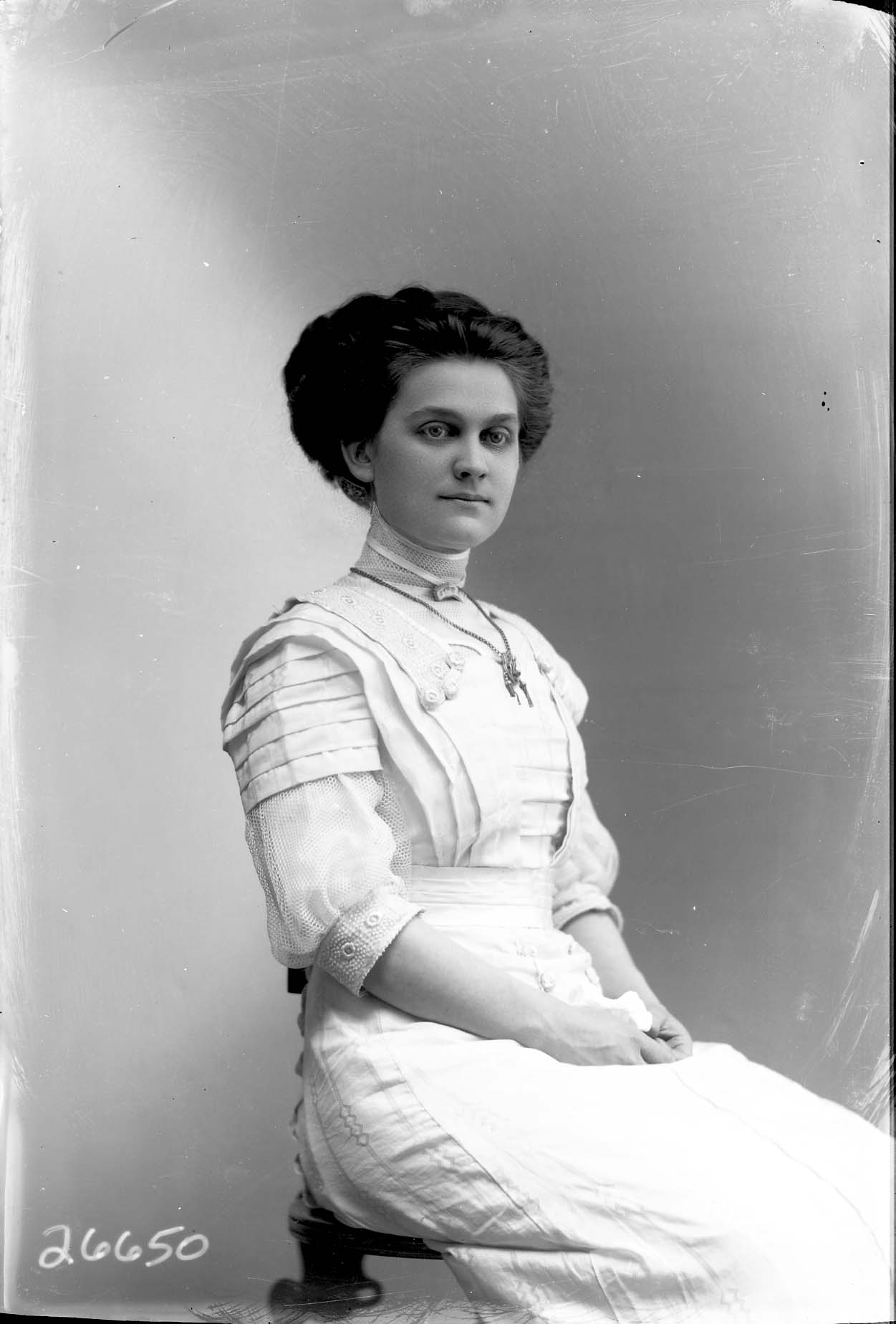 Unidentified woman with her hair styled back is seated on a chair and wearing a necklace with her high-collared dress.