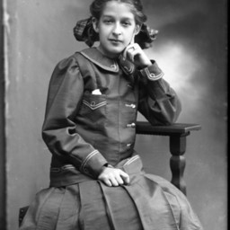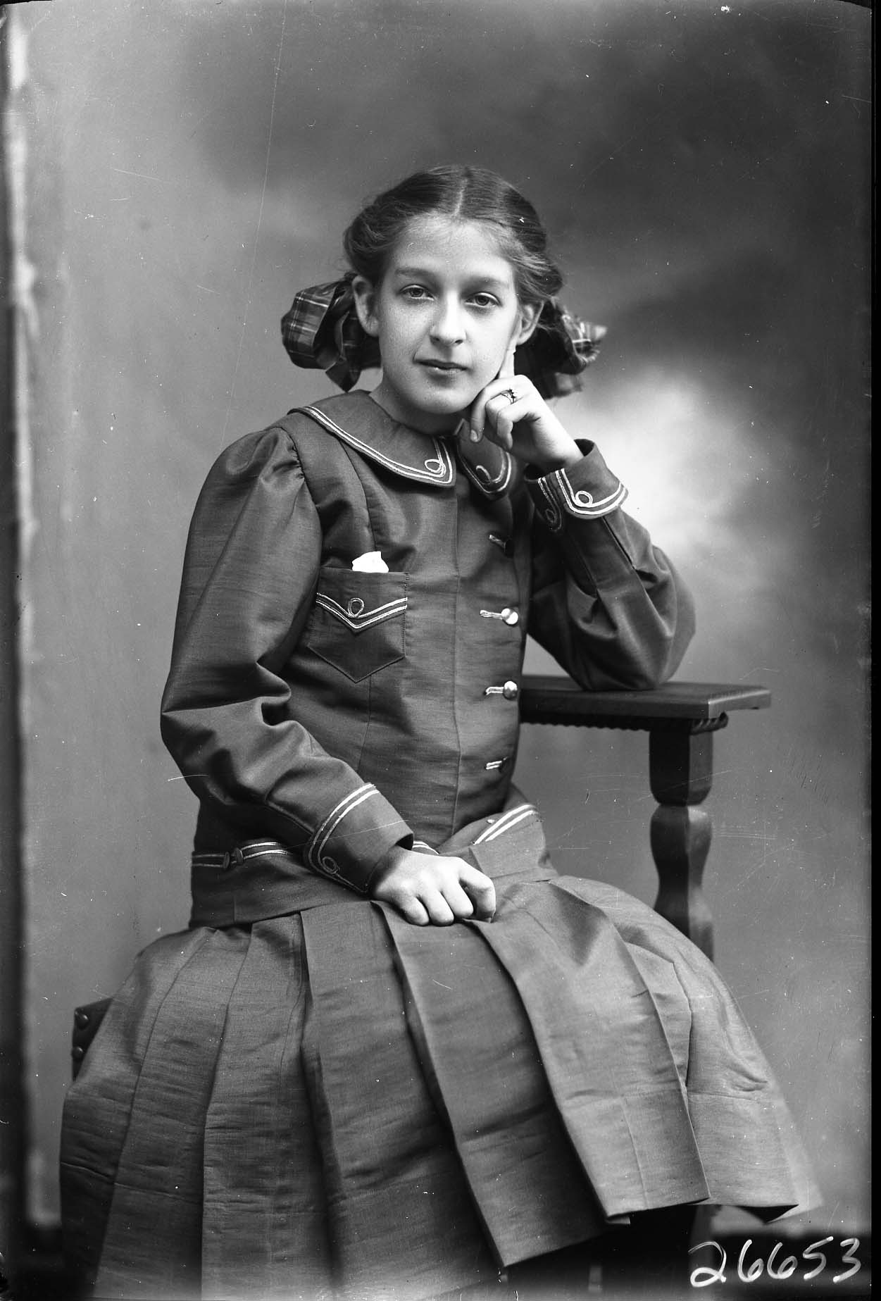 Unidentified girl with a plaid bows in her hair is seated on a chair and posed with her elbow on the chair's arm and her hand against her cheek.