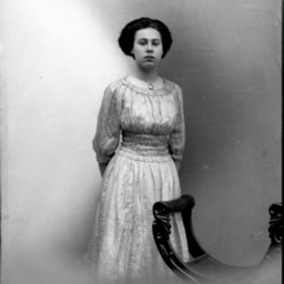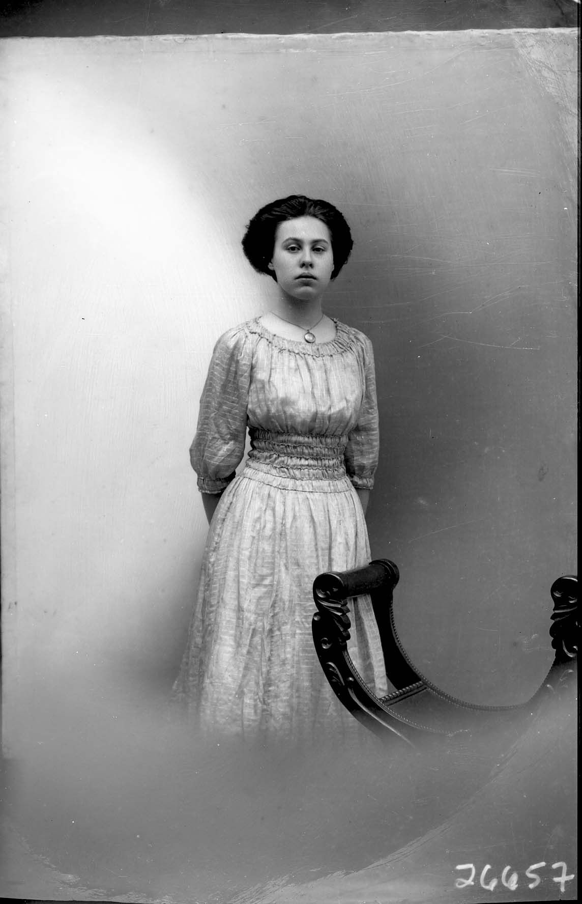 Unidentified woman wearing a locket is standing by a chair with her hands behind her back.