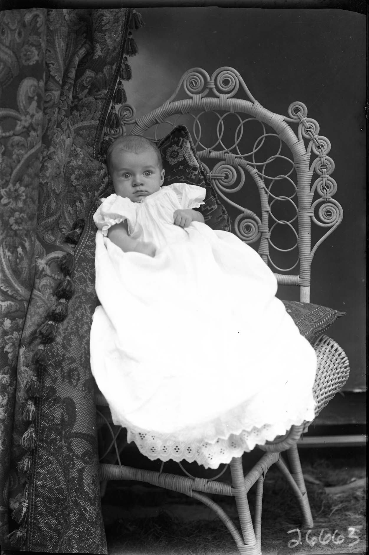 Unidentified baby in a long white gown is propped against pillows on a wicker chair.