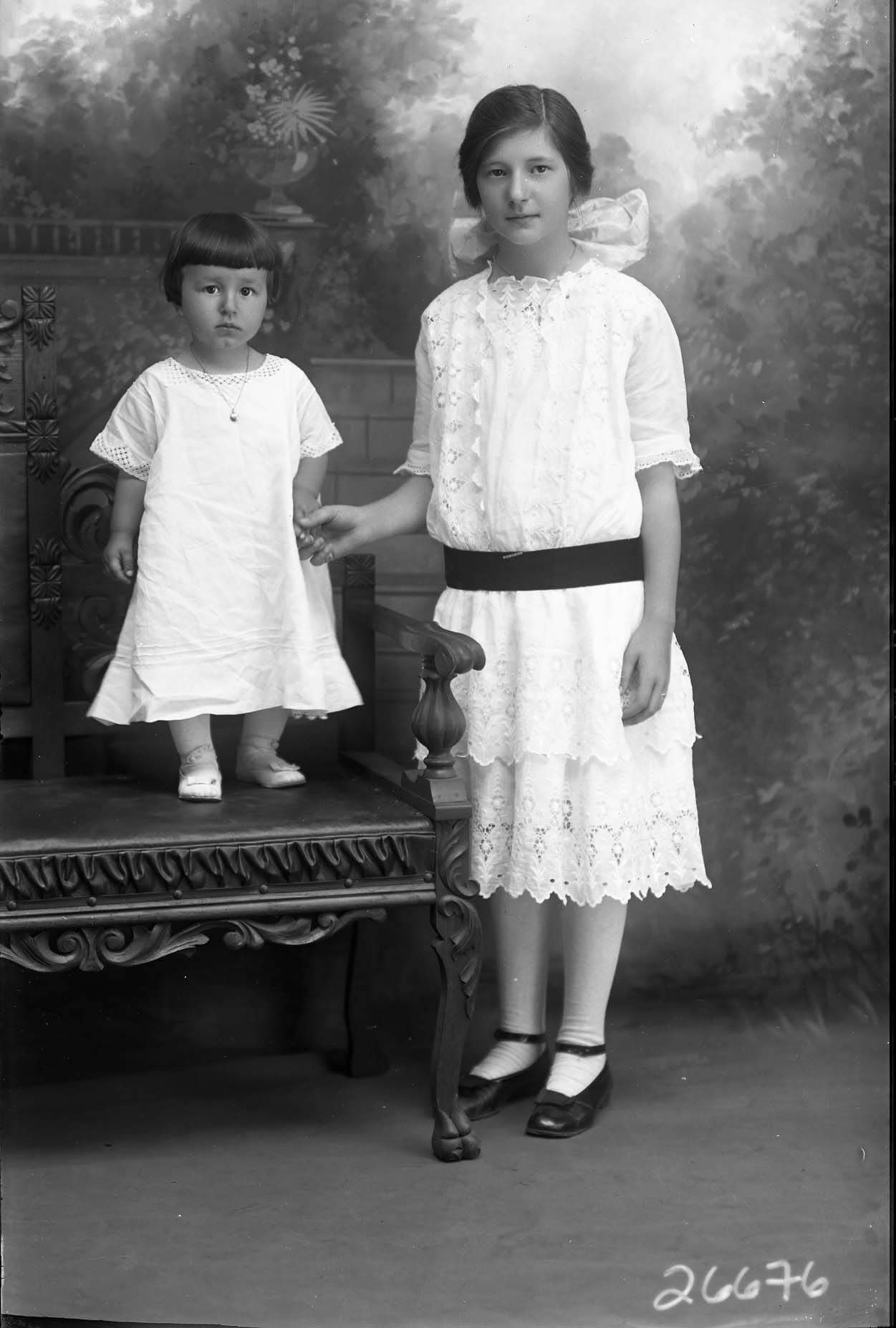 Two unidentified children, a young girl with bangs and an older girl with a large bow in her hair, are standing together with a bench.