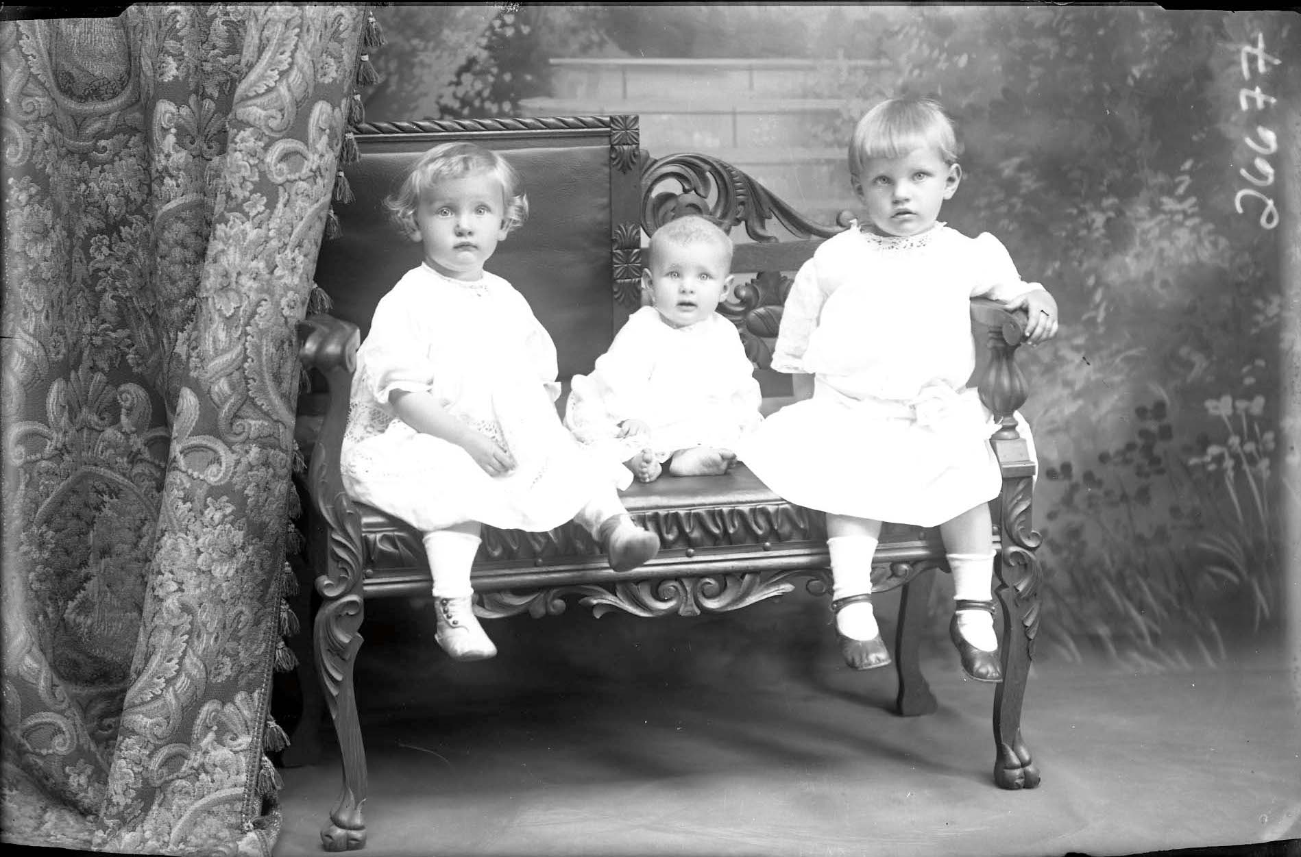 Three unidentified young children, two blond toddlers and a barefoot baby, are posed together on a bench.