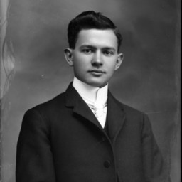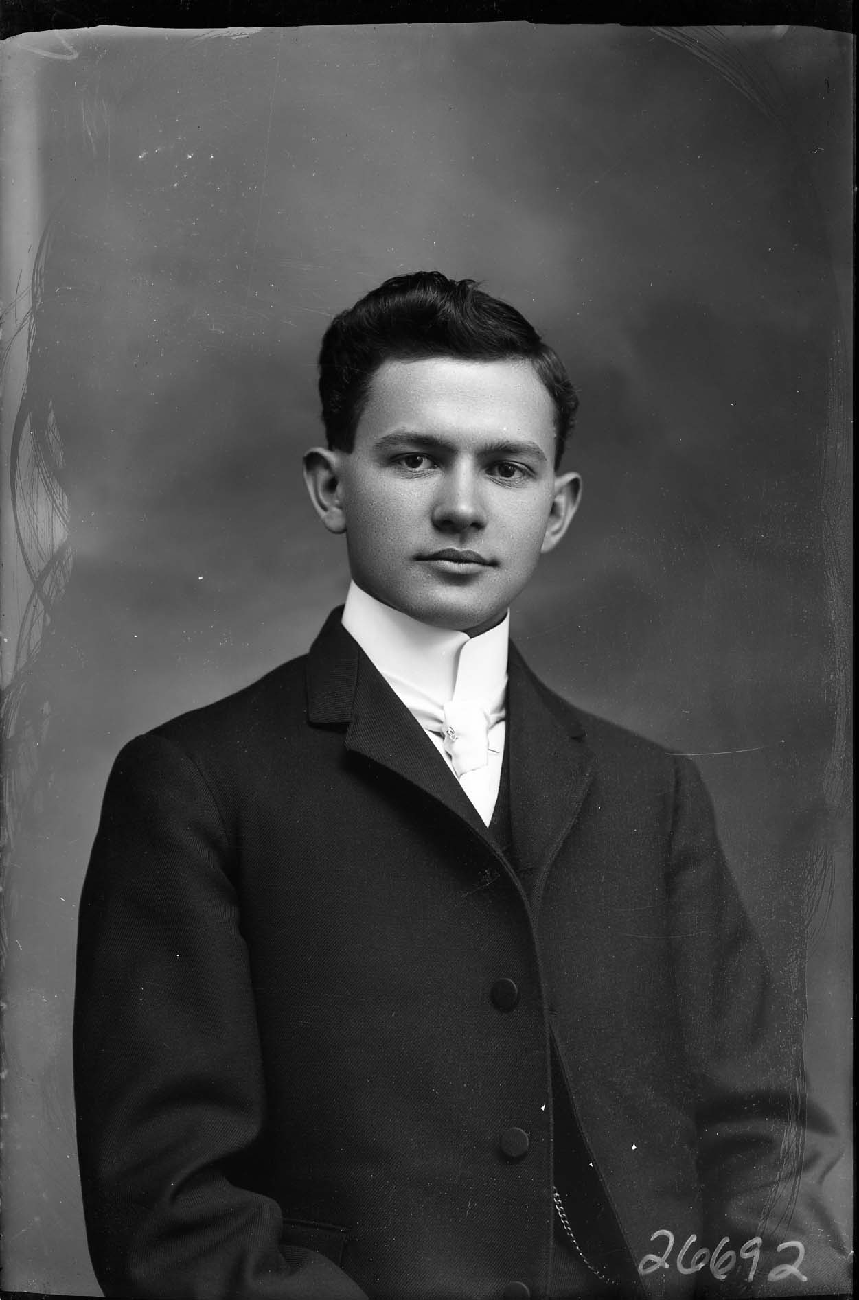 Portrait photograph of an unidentified young man wearing a suit and tie with a high, starched collar.
