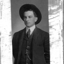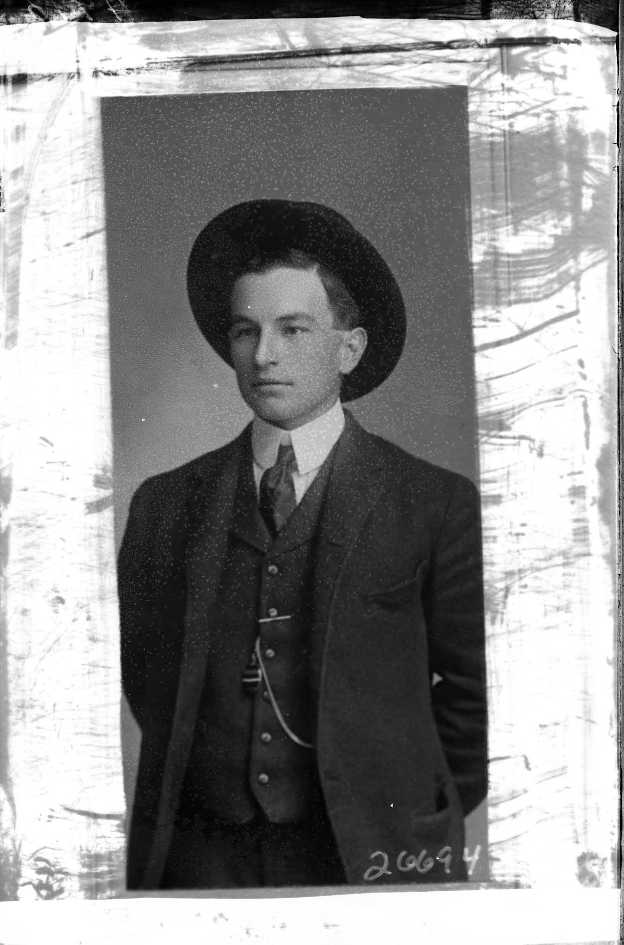 Photo of a photograph of an unidentified young man in a hat and wearing a suit and tie with a starched collar.