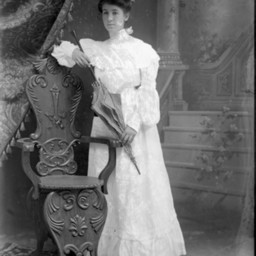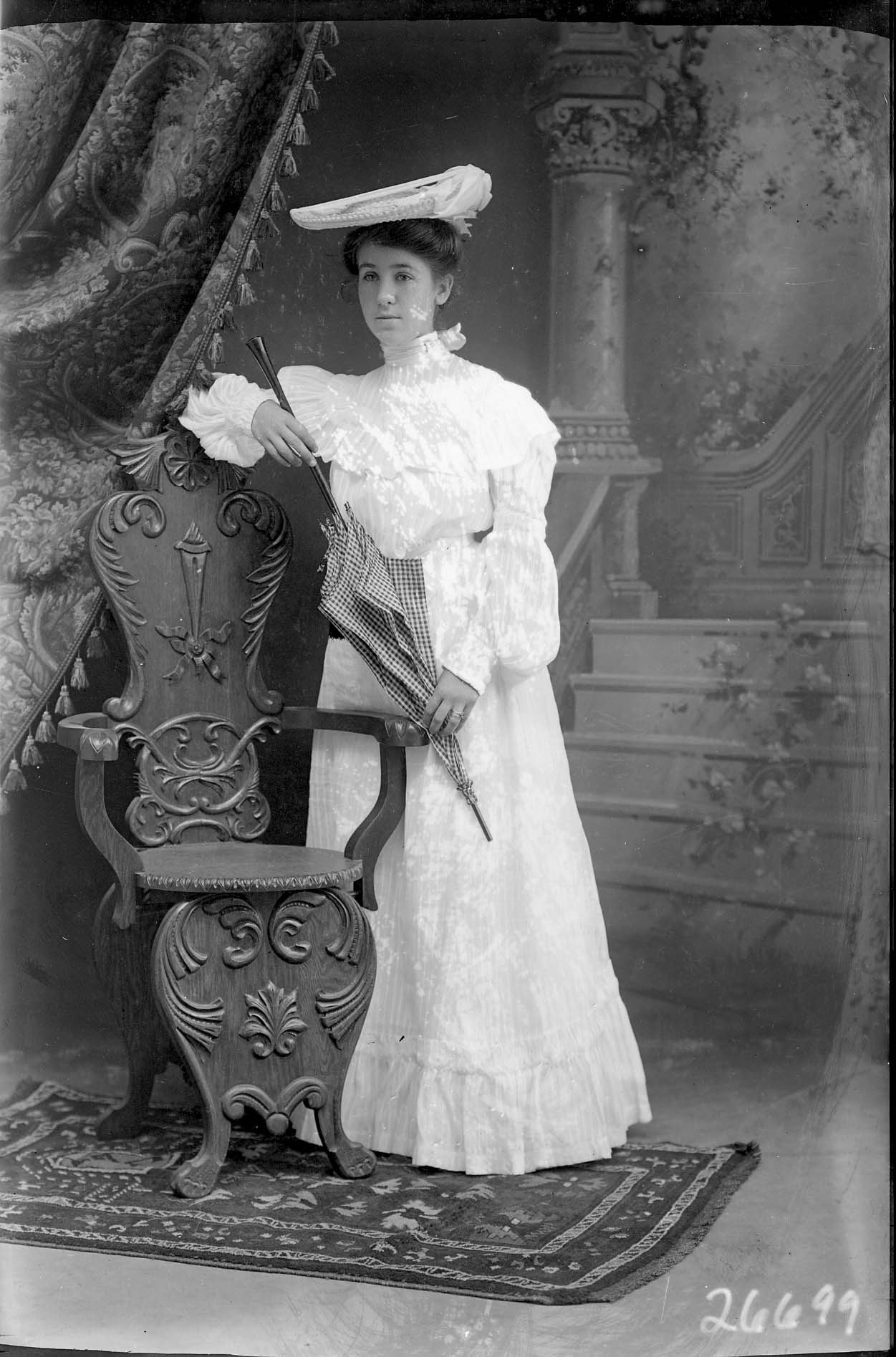 Unidentified young woman is standing by a chair and wearing a hat and long dress. She is holding a checkered umbrella.